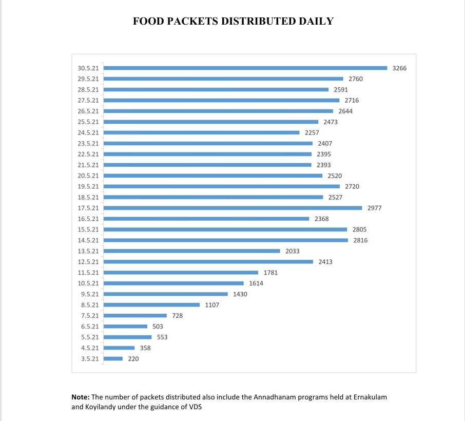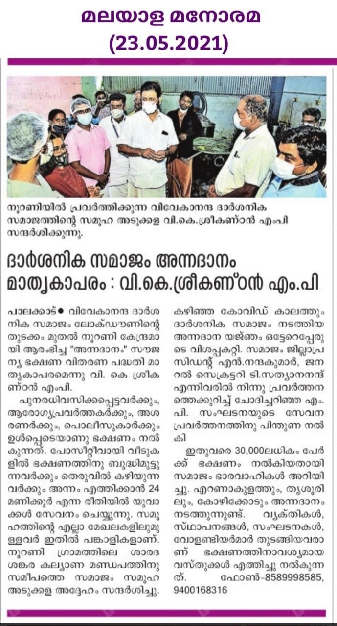 The Vivekananda Darshanika Samajam, Palakkad, successfully carried out an extensive Annadhanam (food donation) initiative during the COVID-19 lockdown period from 3rd May 2021 to 30th May 2021. The program aimed to provide free meals to individuals most affected by the pandemic, particularly those in quarantine and economically disadvantaged communities.