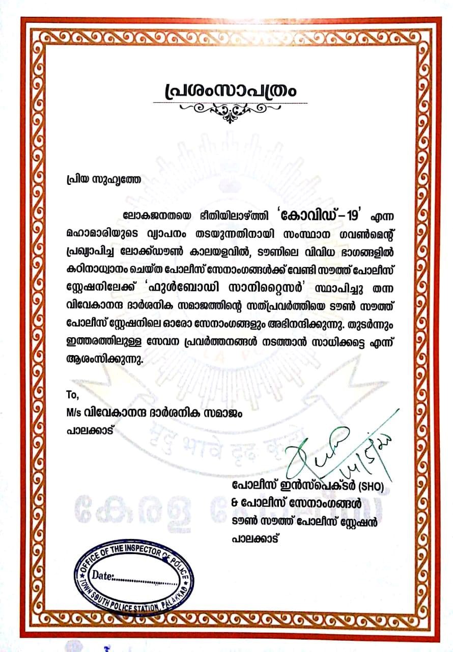 As part of infection prevention measures for frontline personnel, VDS designed and built a Foot-Operated Sink and Body Sanitizer System. This fully functional unit was formally handed over to Palakkad South Police Station to help ensure safer hygiene practices among police officers and visitors. In recognition of this timely contribution, the Kerala Police awarded a Certificate of Merit to the Samajam, honoring its dedicated service to public health.