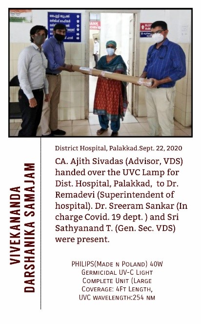 As part of extending UVC technology to more sectors, on 22 September 2020, a state-of-the-art UVC disinfection unit, comprising advanced UVC lamps and a UV driver imported from Poland, was formally handed over to the District Government Hospital, Palakkad. The system was presented by C.A. Ajith Sivadas, Advisor to VDS, to the hospital’s Superintendent Dr. Ramadevi. This installation enables rapid disinfection of hospital equipment and surfaces within minutes, offering a vital layer of safety for both healthcare professionals and patients.